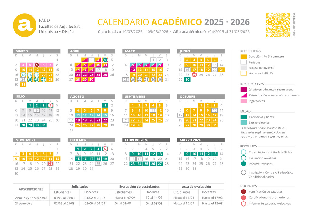 En esta sección encontrarás el Calendario Académico oficial de la FAUD, con todas las fechas importantes: inicio y finalización de clases, períodos de exámenes, inscripciones y recesos. Una herramienta indispensable que podes descargar. Destinado a estudiantes, docentes y nodocentes que deseen planificar sus actividades de manera eficiente. ¡Organizá tu año académico con facilidad!.